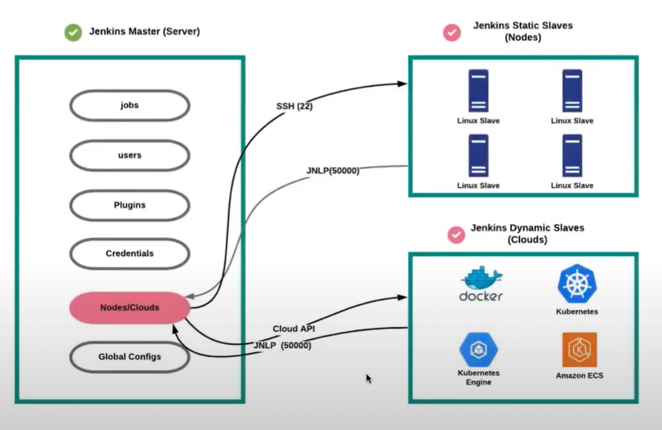 - Непосредственное выполнение задач может происходить на различных типах окружения: статические агенты (виртуальные и реальные машины), динамические агенты (Docker, Kubernetes)